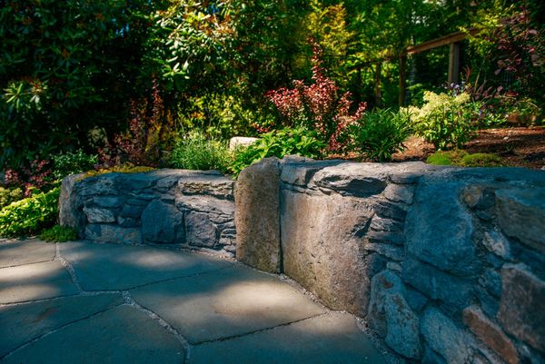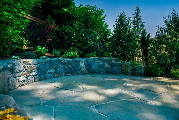 Basalt stone retaining wall and bench, pennsylavnia bluestone patio, flagstone patio, planting.