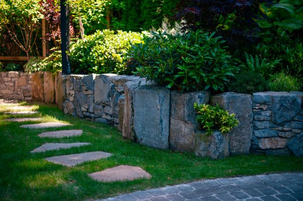 Basalt stone boulders and mortared basalt stone retaining wall, plants, North Vancouver landscaping